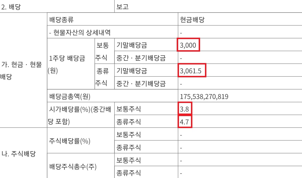 우선주는 1주당 3,061.5원으로 4.7%의 배당을 하였습니다.