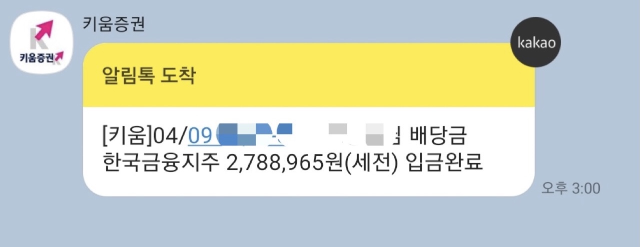 지난주 금요일(2021-04-09)에 한국금융지주 배당금을 받았습니다.