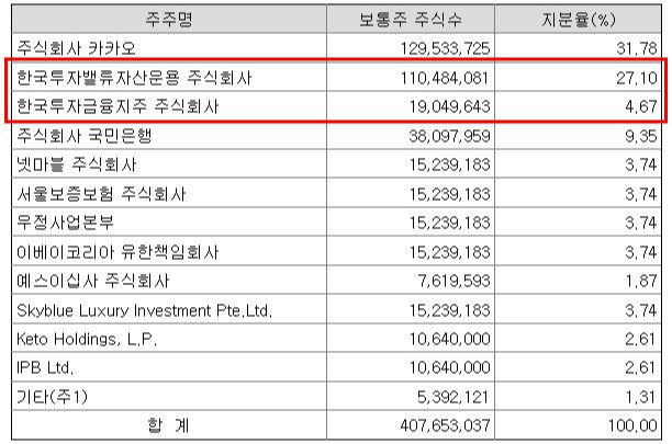 한국금융지주는 카카오뱅크 지분을 31.77% 소유하고 있습니다.